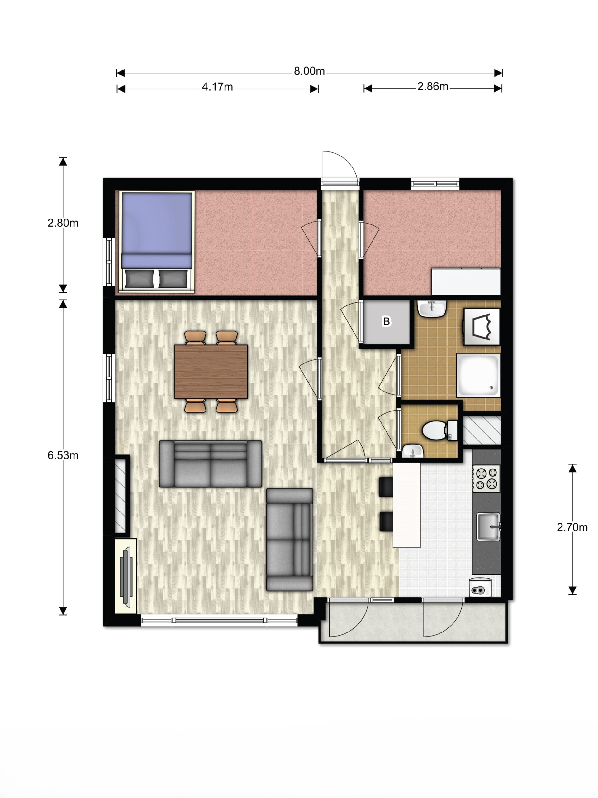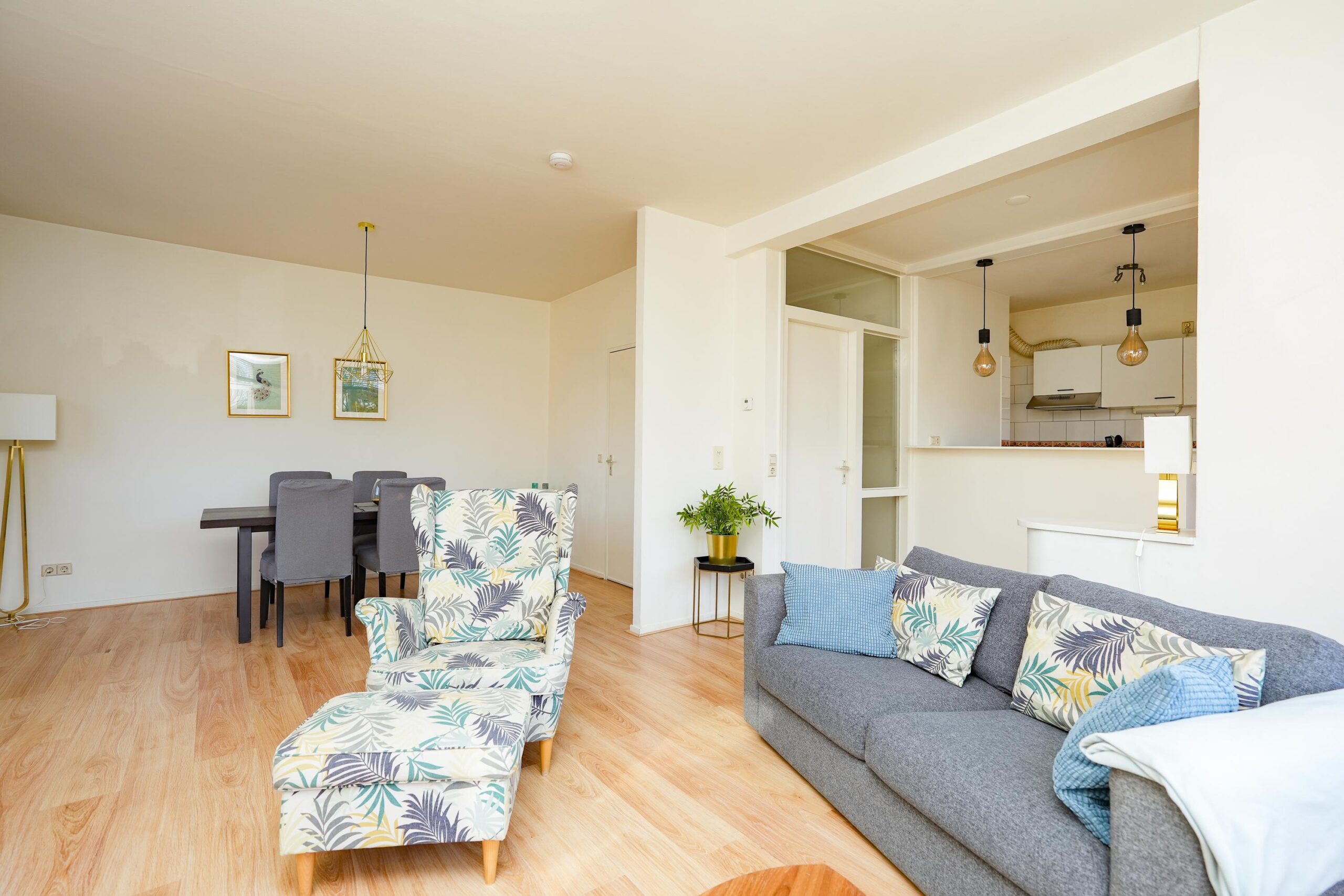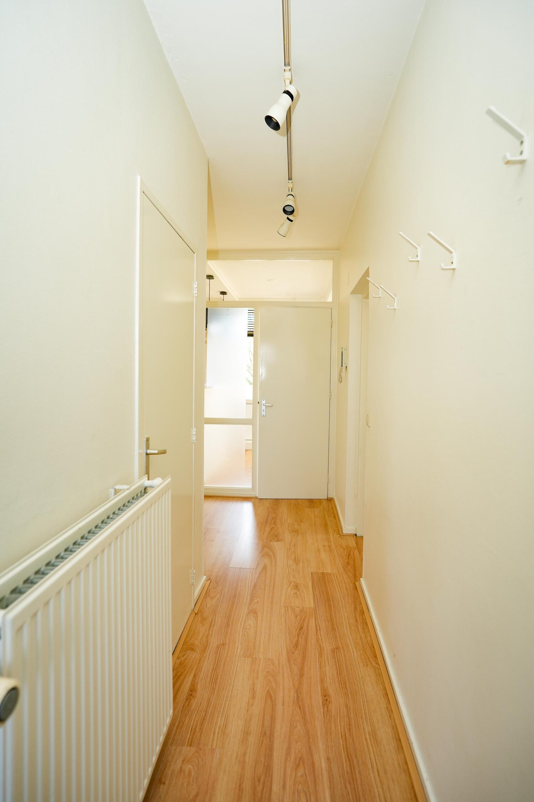 Appartement: entree, gang, 2 royale slaapkamers, bergingskast, moderne badkamer met douche, wasmachine aansluiting en vaste wastafel. Apart toilet met fontein. Ruime woonkamer met eetbar en open keuken, deur naar zonnig balkon met vaste kast.