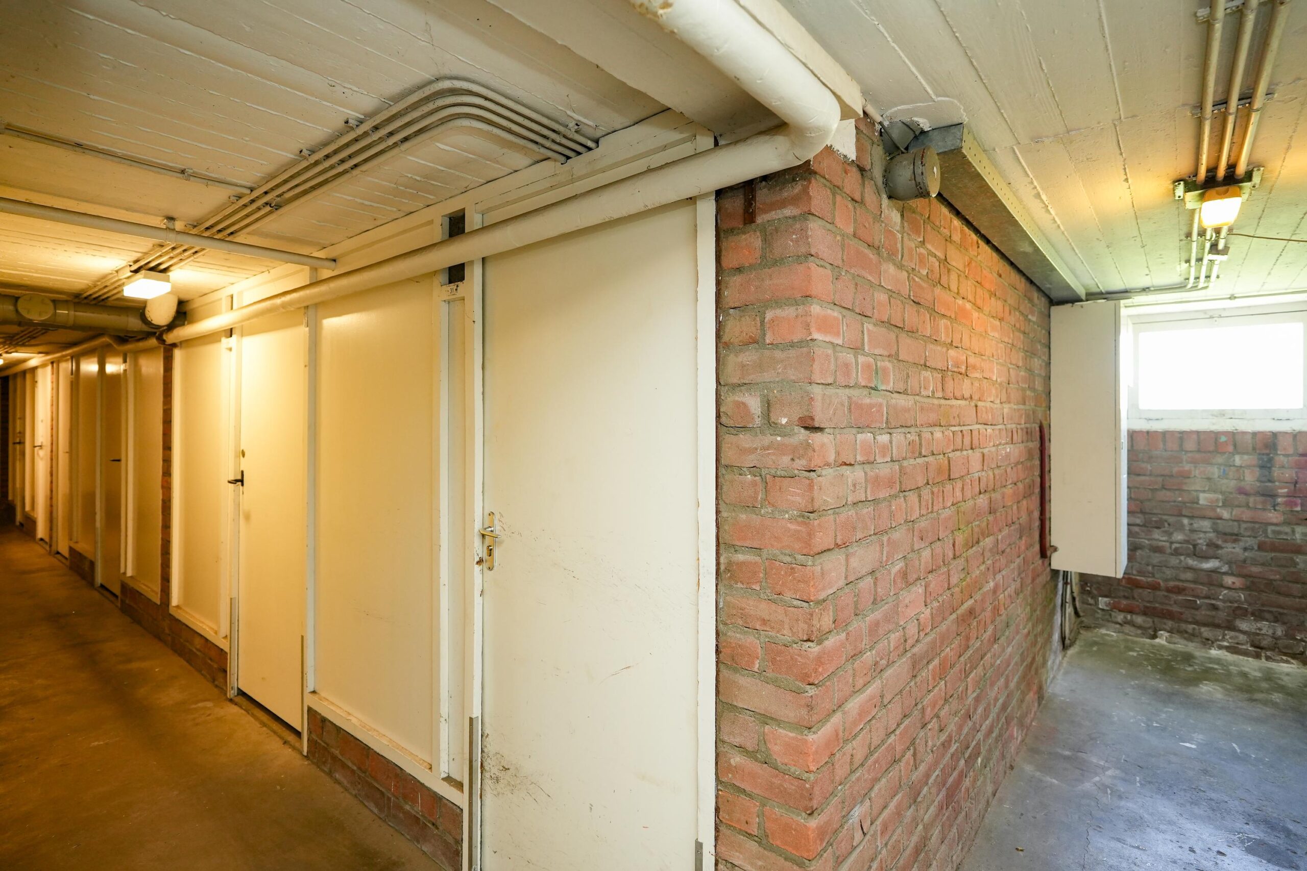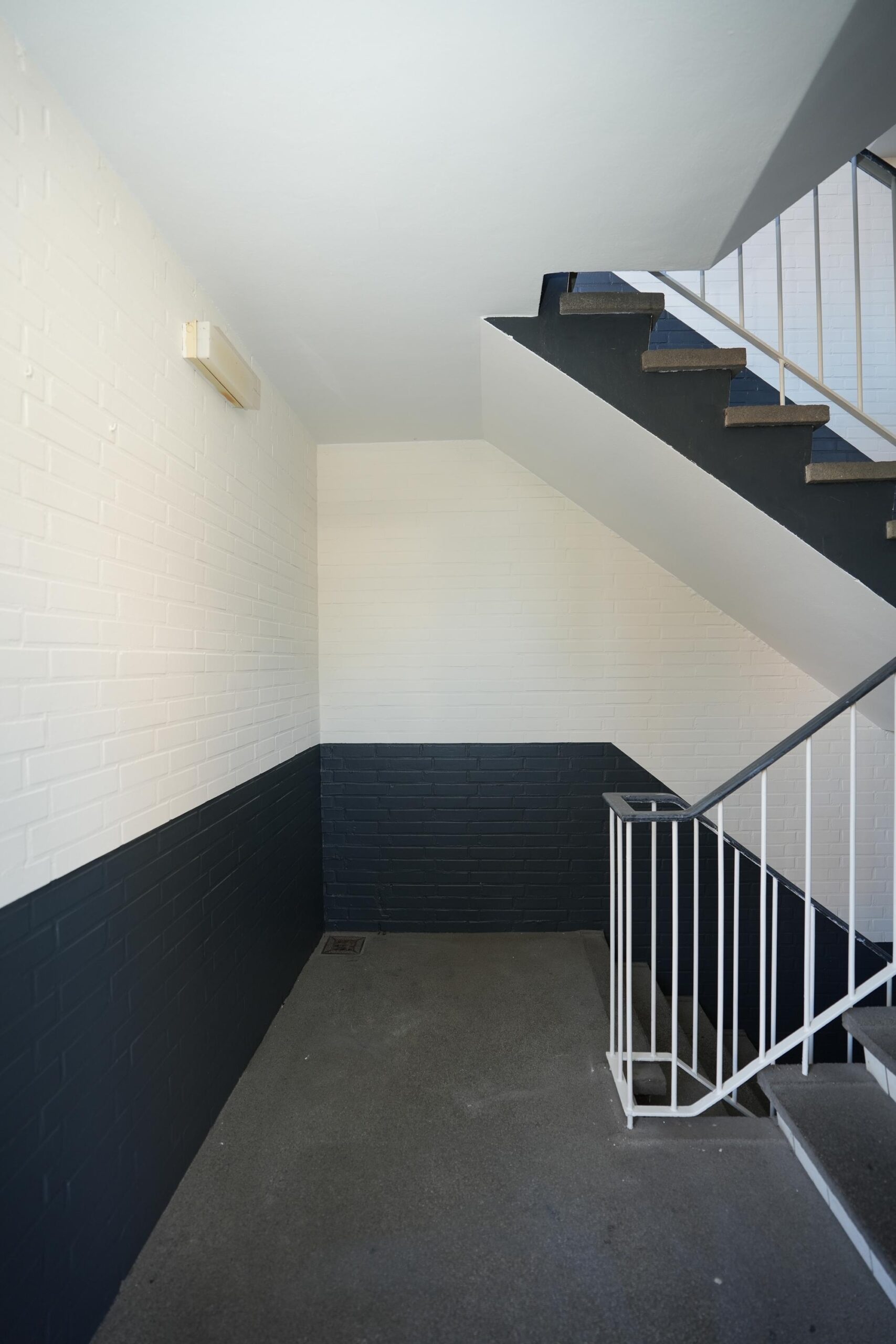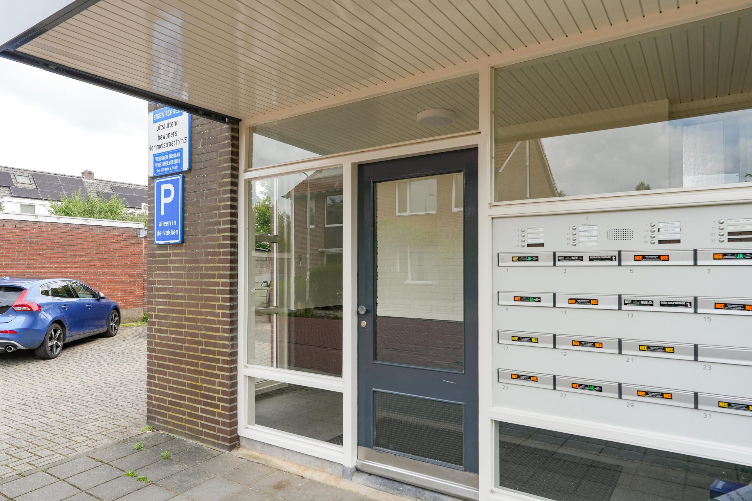Begane grond: Entree met voordeurbellen, intercom en brievenbussen, trap naar de bergingen.