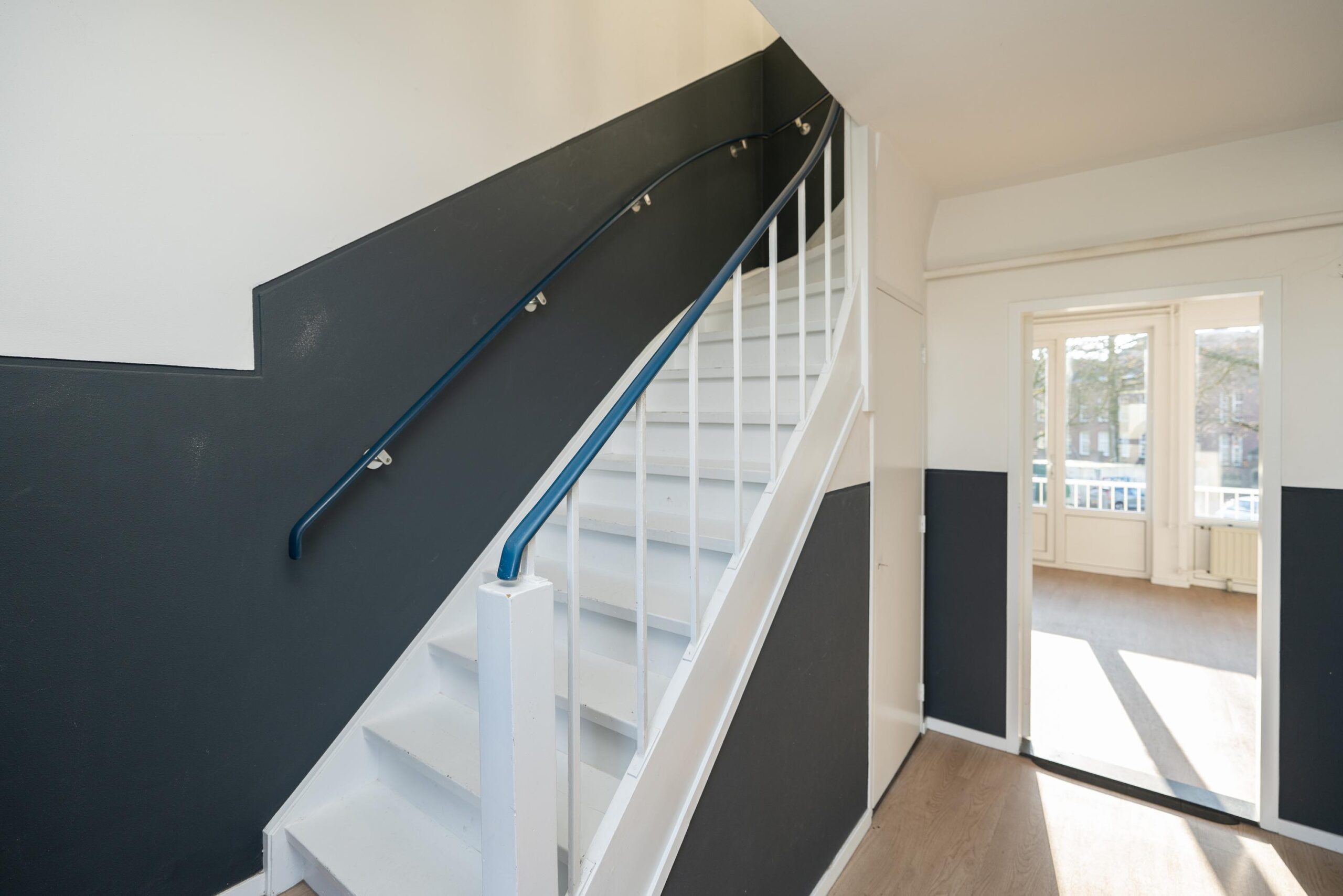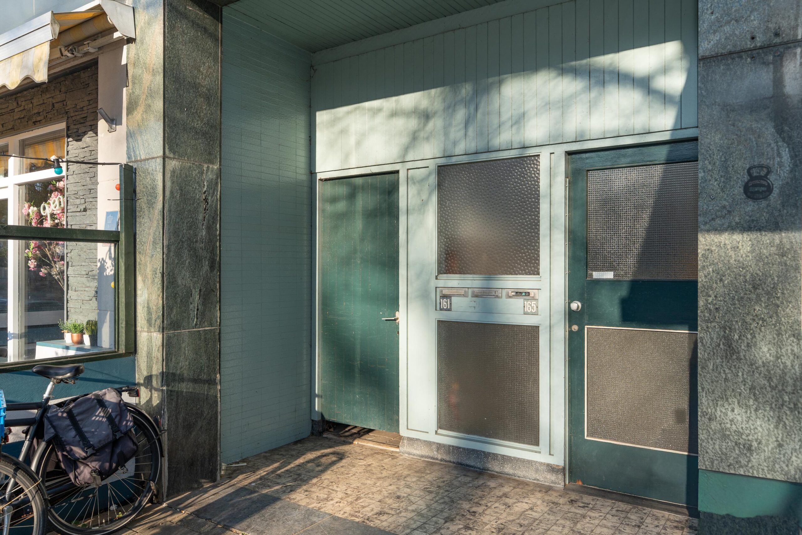 Begane grond: centrale entree, voordeurbel en brievenbussen, trappenhuis naar de appartementen en naar de berging in het souterrain.